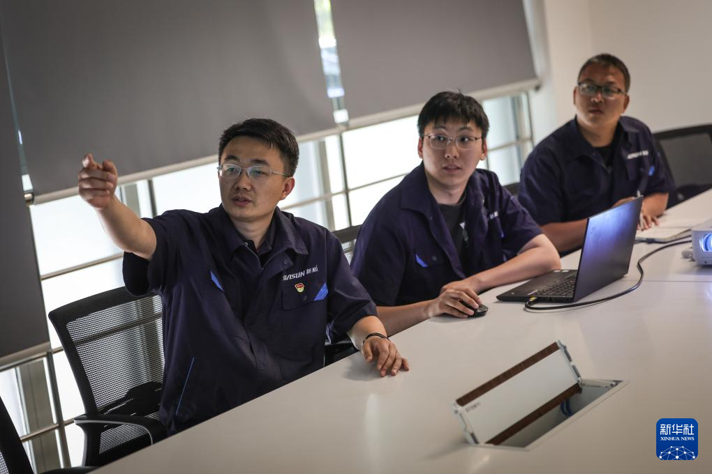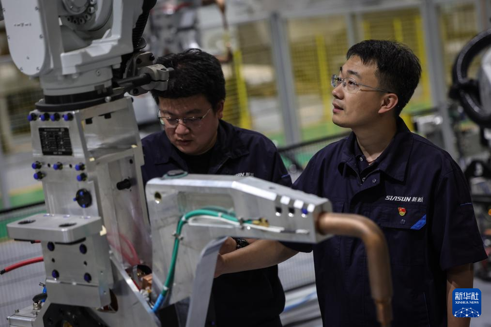 那鹏(右)和同事在测试验证为点焊机器人新开发的功能(6月3日摄)。新华社记者 潘昱龙 摄pagebreak