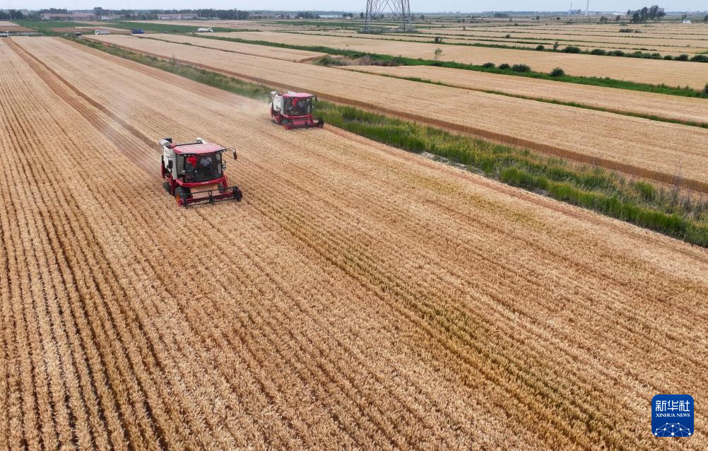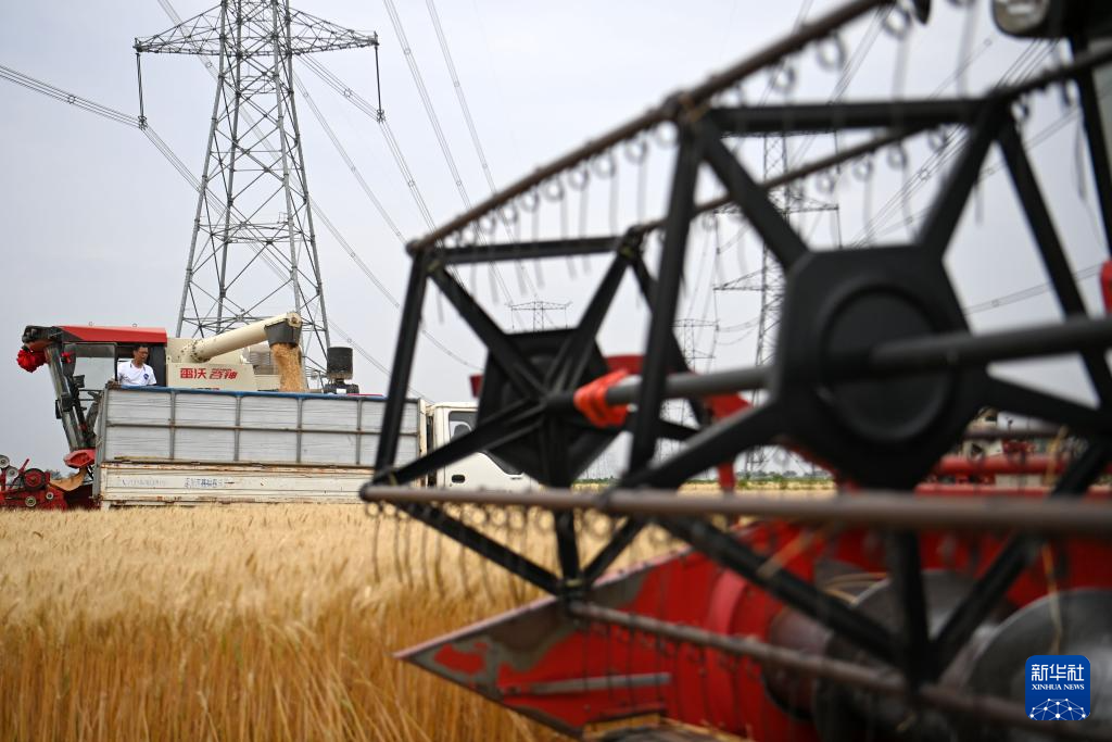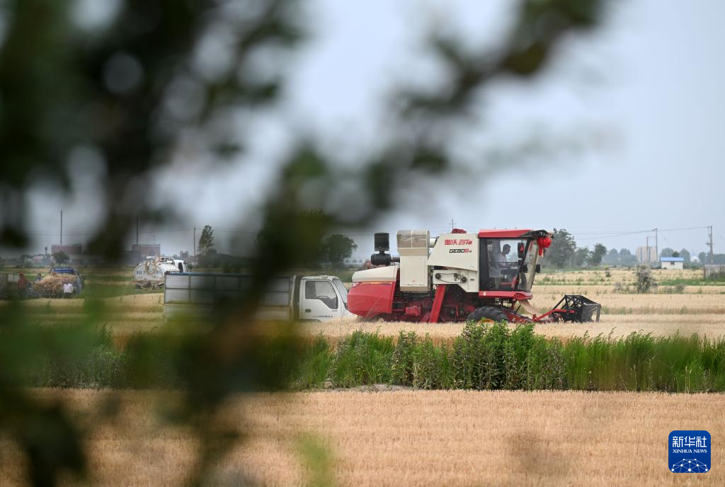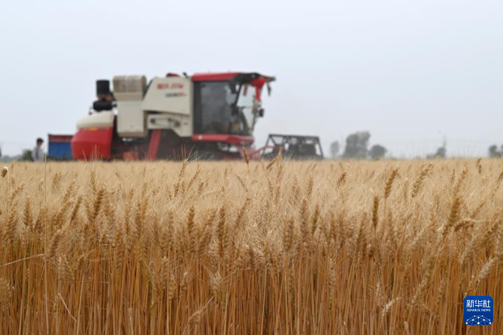 6月7日,联合收割机在天津市静海区中旺镇蔡庄子村田间收获小麦。