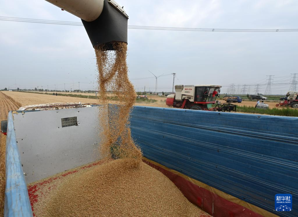 6月7日,在天津市静海区中旺镇蔡庄子村,联合收割机将收获的小麦装车。