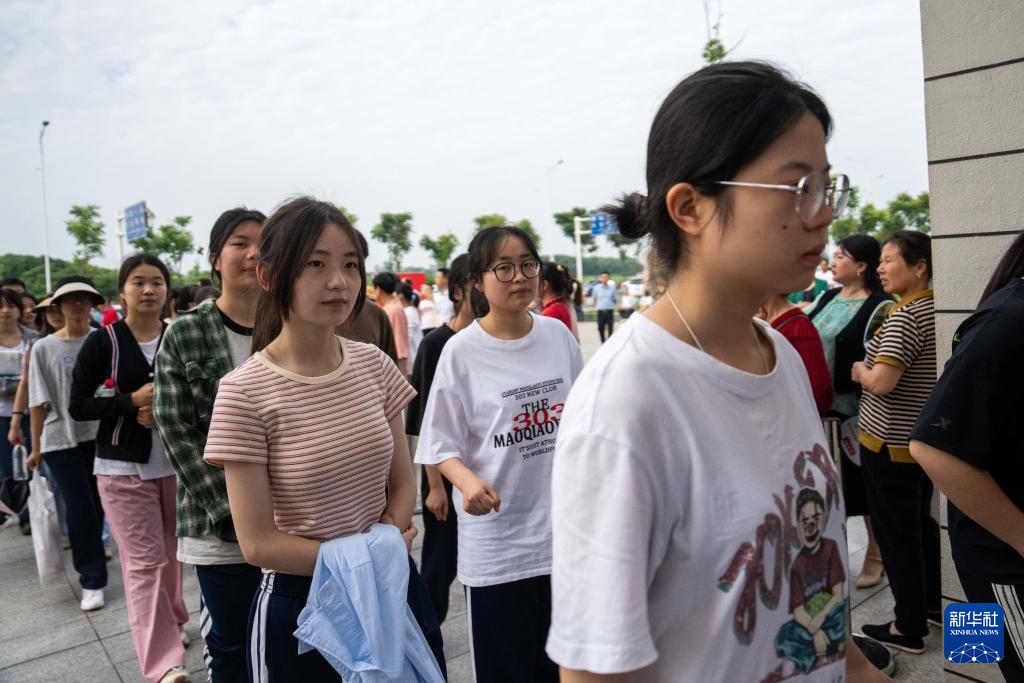 6月7日,考生在安徽合肥市五十中学天鹅湖教育集团天鹅湖校区考点内候考。