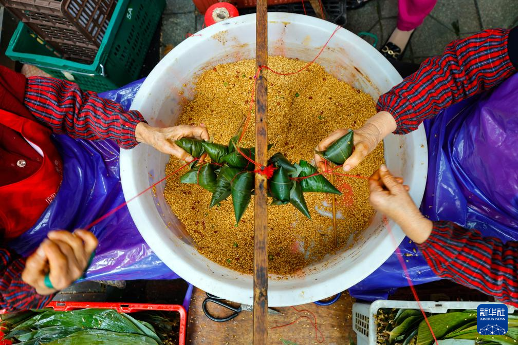 6月7日,在四川省成都市的“粽子一条街”上,一家粽子店的工作人员在包粽子。