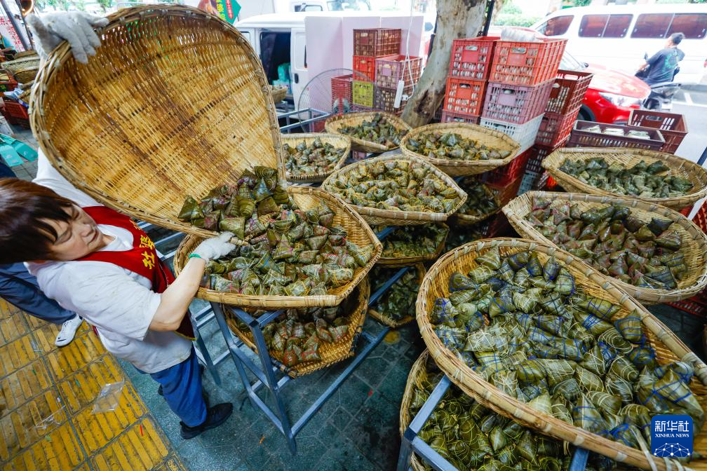 6月7日,在四川省成都市的“粽子一条街”上,一家粽子店的工作人员在摆放做好的粽子。