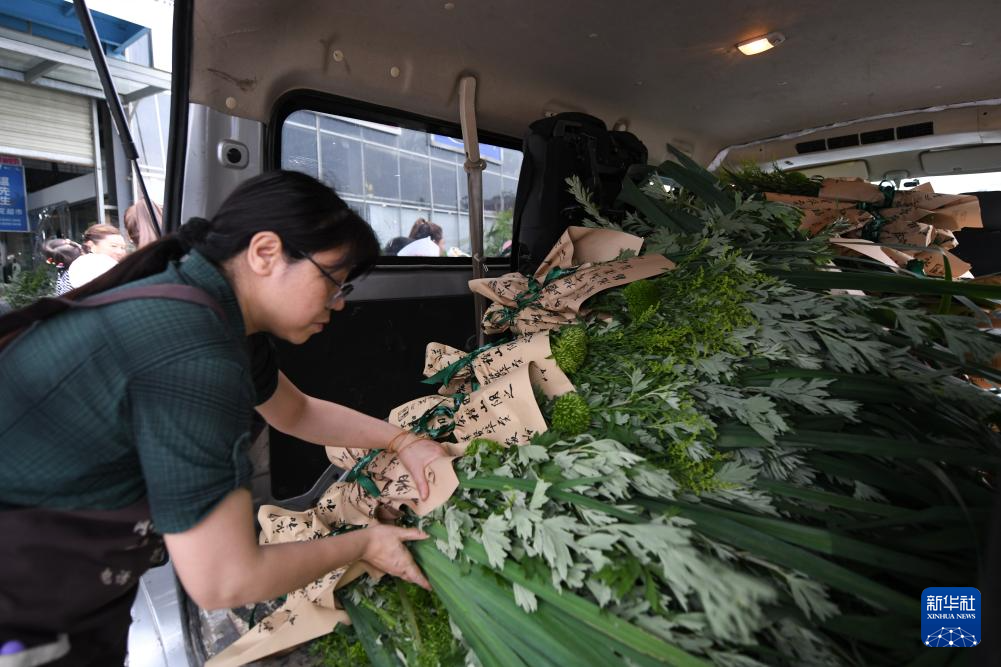 6月6日,在四川省成都市郫都区的一家花店,店员将包扎好的艾草花束装车为客户送出。