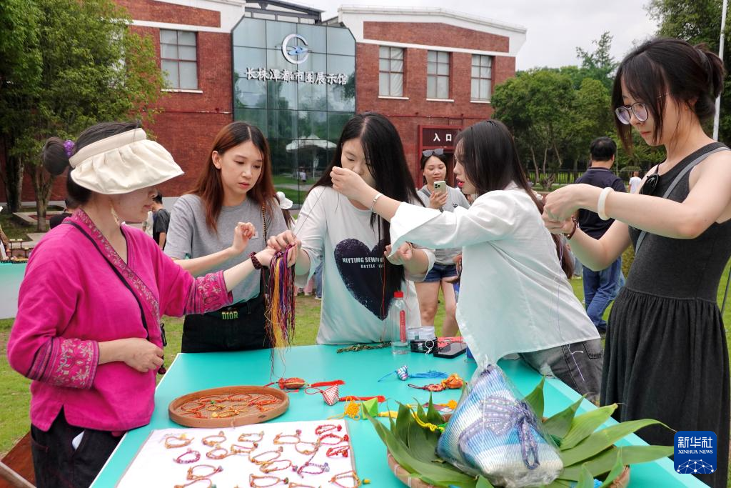 6月7日,在湖南省长沙市的橘子洲景区,市民、游客在体验编织五彩绳,寓意祈福纳吉。