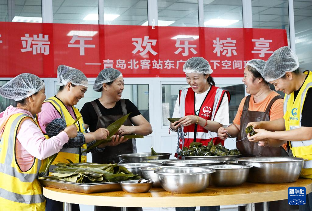 6月7日,在山东省青岛市,中铁建工青岛北客站一项目部的职工在一起包粽子。