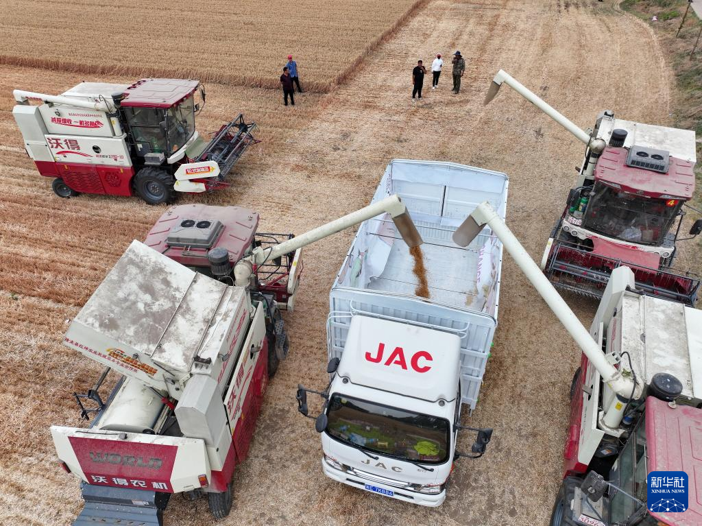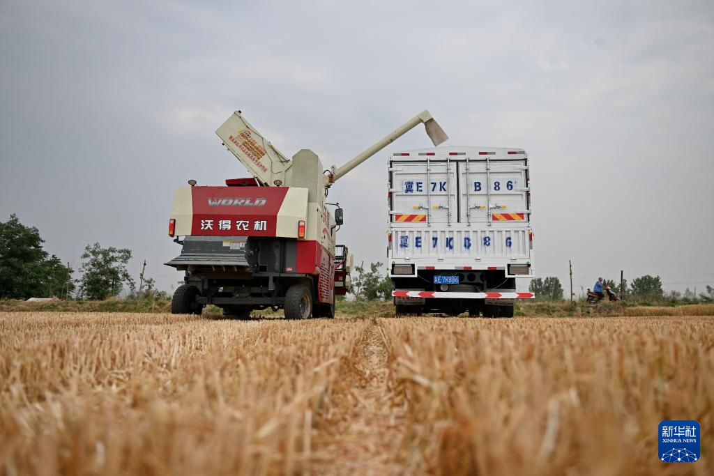 6月7日,收割机在河北省邢台市隆尧县固城镇东王村麦田里卸载收获的小麦。