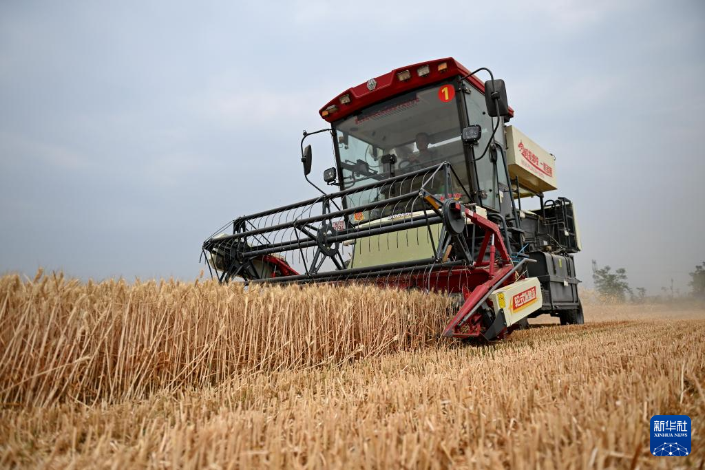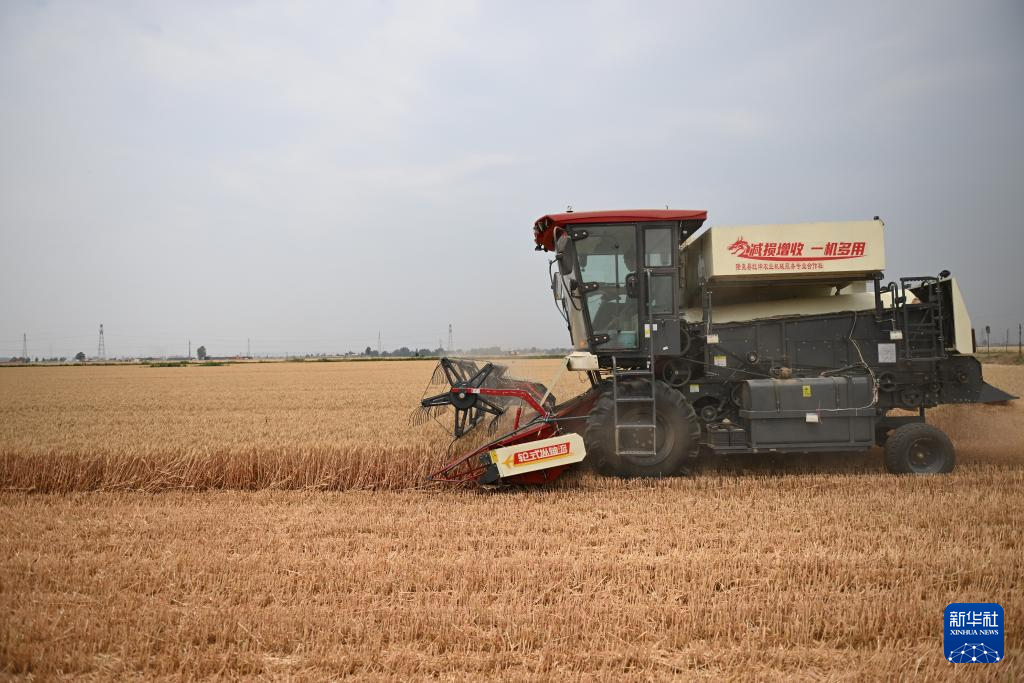 6月7日,收割机在河北省邢台市隆尧县固城镇东王村麦田里收获小麦。