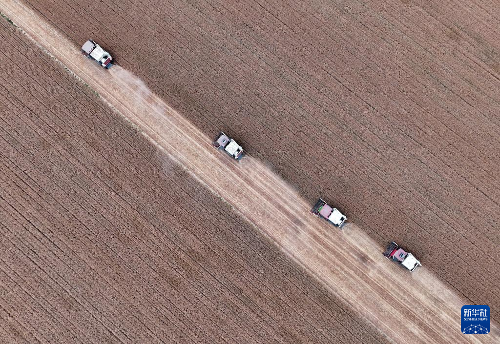 6月7日,收割机在河北省邢台市隆尧县固城镇东王村麦田里收获小麦(无人机照片)。