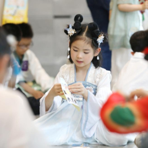 6月8日,小朋友在河南省洛阳市老城区体验制作古代服饰。