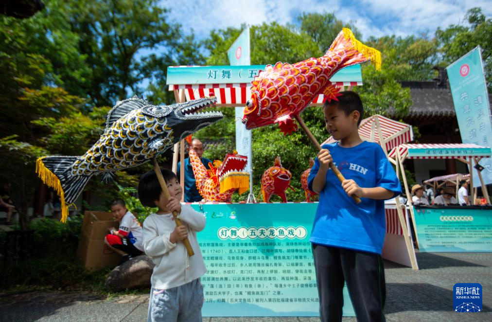 6月8日,在福建武夷山市举办的文化和自然遗产日活动中,孩子们在体验五夫龙鱼戏。