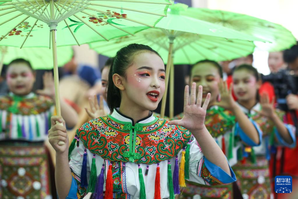 6月8日,小朋友在贵州省黔南布依族苗族自治州都匀市“非遗集市”上演唱山歌。