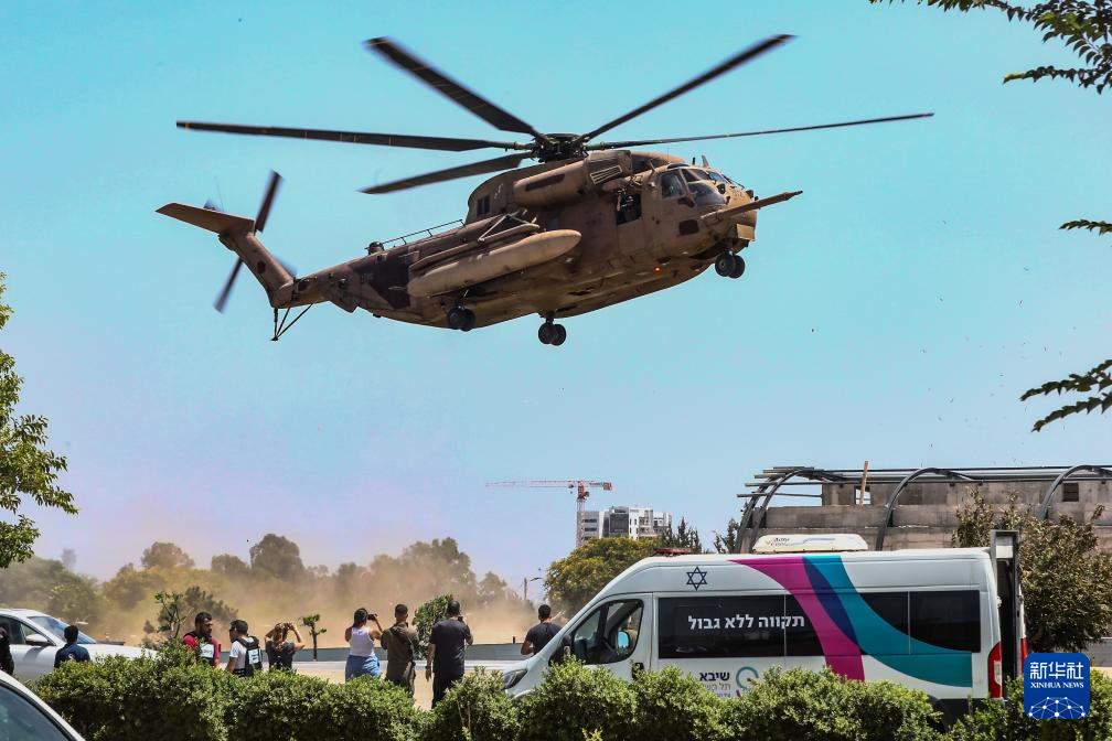 6月8日,搭载被解救的以色列人的直升机抵达以色列拉马特甘一家医院。