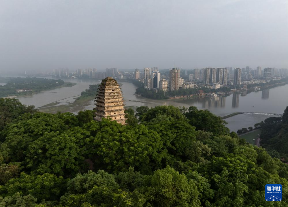 从乐山大佛景区凌云山上远眺乐山市城区(6月4日摄,无人机照片)。