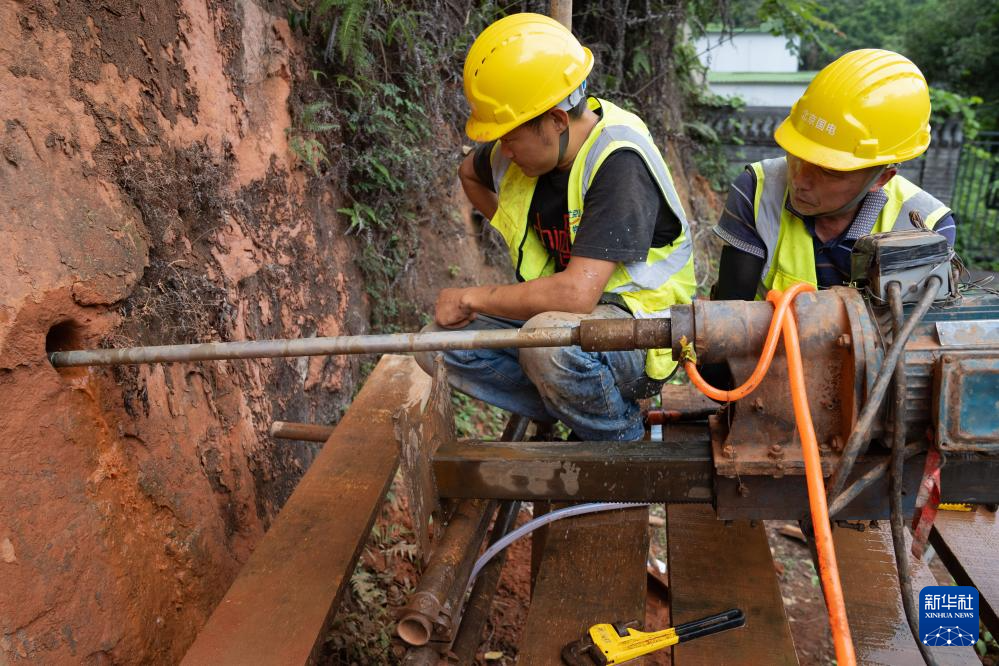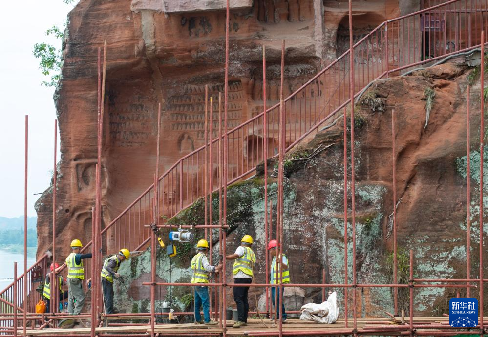 工作人员在景区内非文物区域红砂岩体中取样。这是正在进行的乐山大佛九曲栈道区域危岩体抢险加固工程一期(危岩体加固试验与监测)(6月4日摄)。