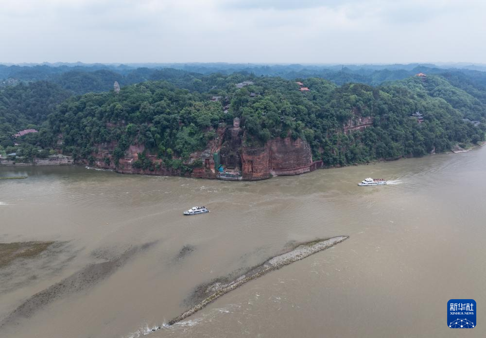 乐山大佛是一尊石刻弥勒佛坐像,坐落于凌云山中,依山取势,坐东向西,山体就是佛身,脚下是岷江、大渡河、青衣江三江汇合的要冲(6月4日摄,无人机照片)。