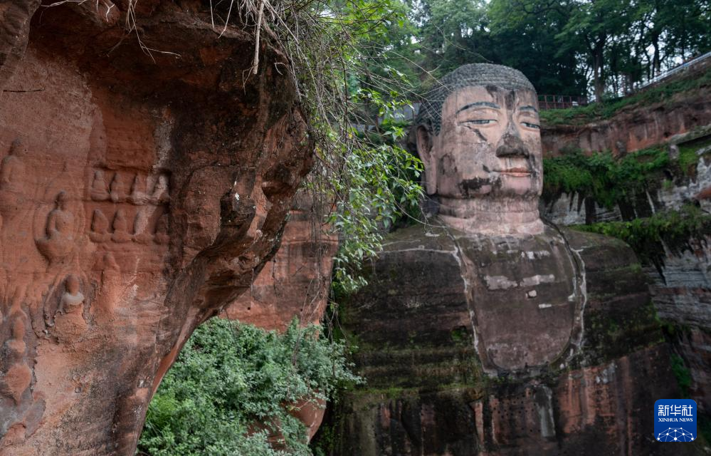 乐山大佛及岩壁上的摩崖造像(6月4日摄)。