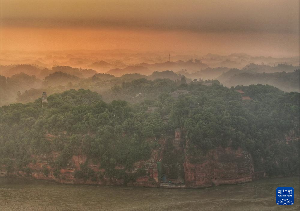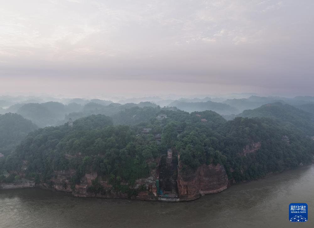 晨曦中的乐山大佛(6月4日摄,无人机照片)。