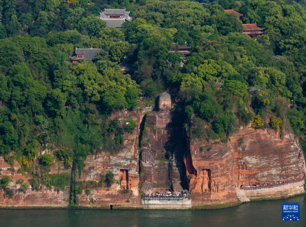 乐山大佛是一尊石刻弥勒佛坐像,坐落于凌云山中,依山取势,坐东向西,山体就是佛身,脚下是岷江、大渡河、青衣江三江汇合的要冲(4月18日摄,无人机照片)。
