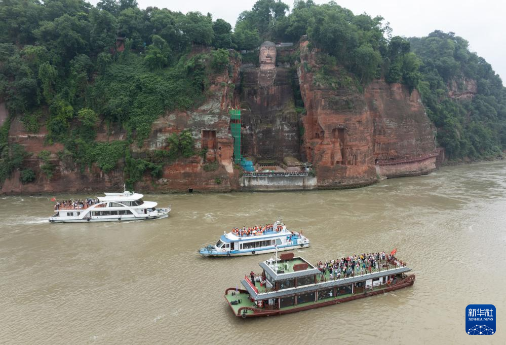游客乘坐游船远眺乐山大佛(6月4日摄,无人机照片)。