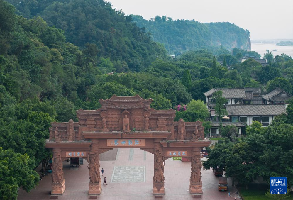 由雕刻大师叶毓山设计并雕刻的乐山大佛牌坊(6月4日摄,无人机照片)。
