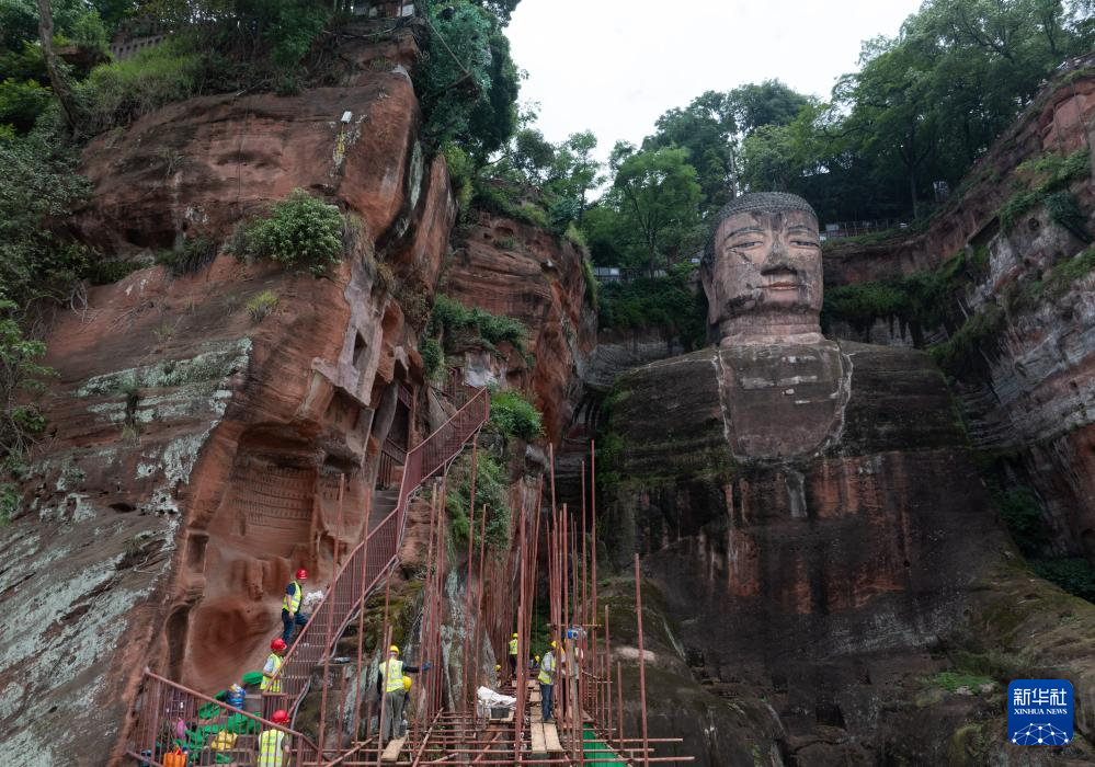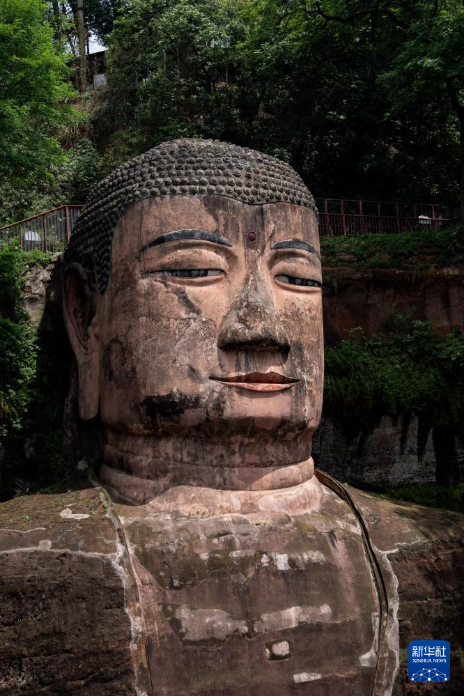 这是乐山大佛局部(6月4日摄,无人机照片)。