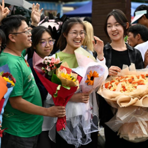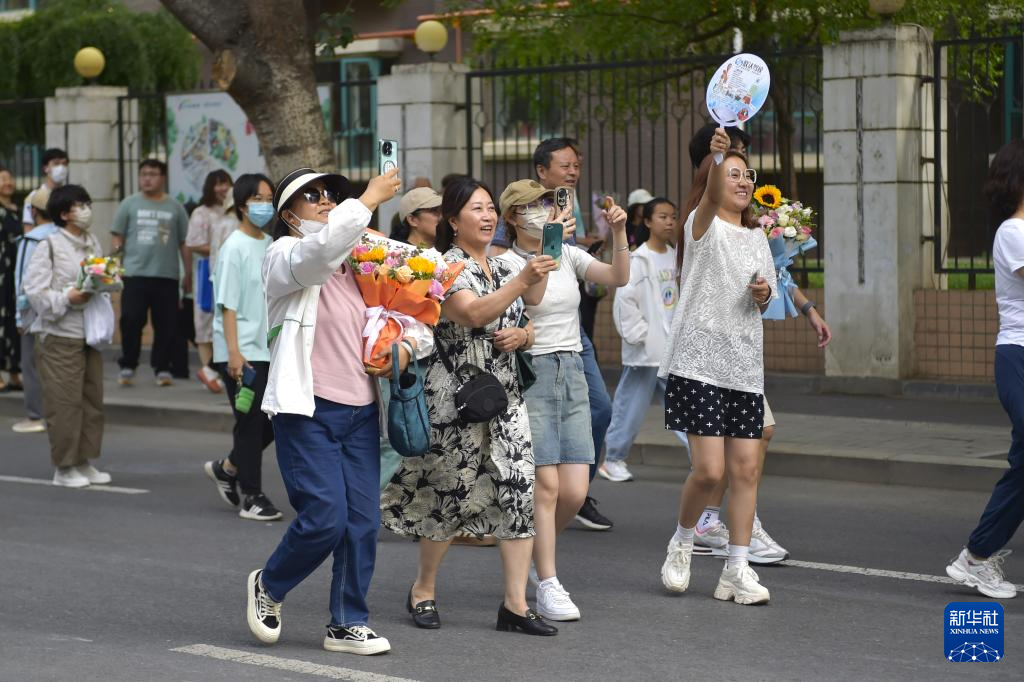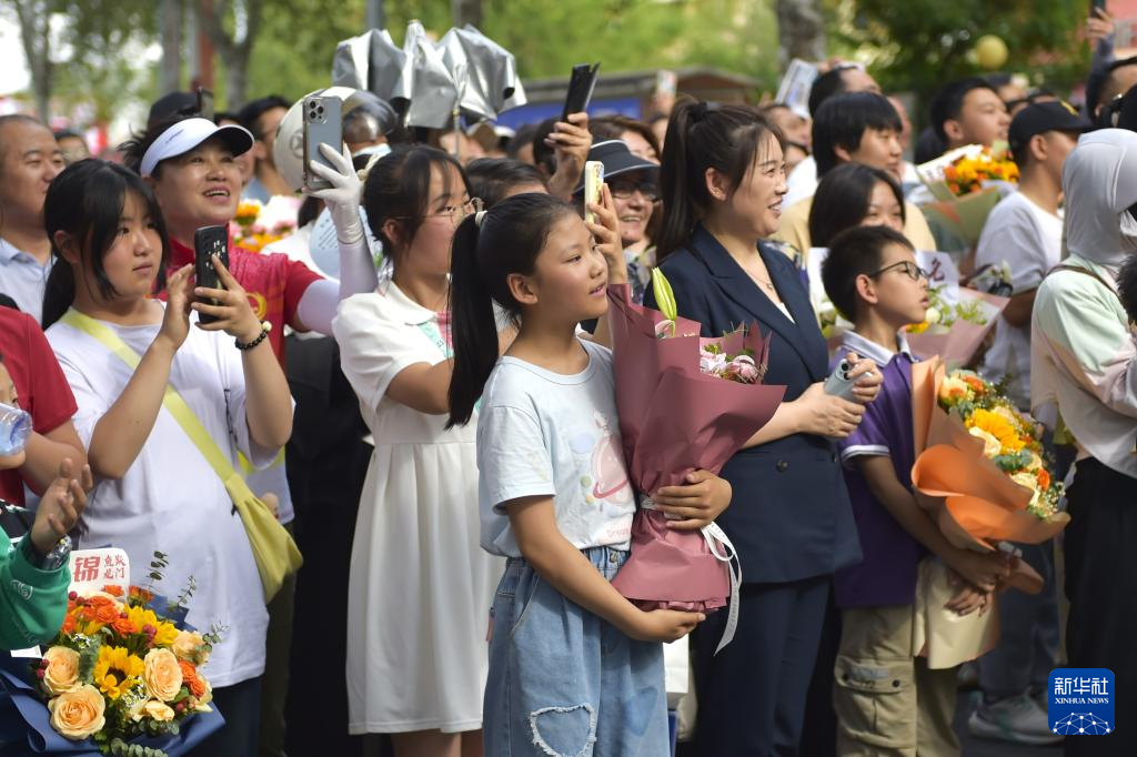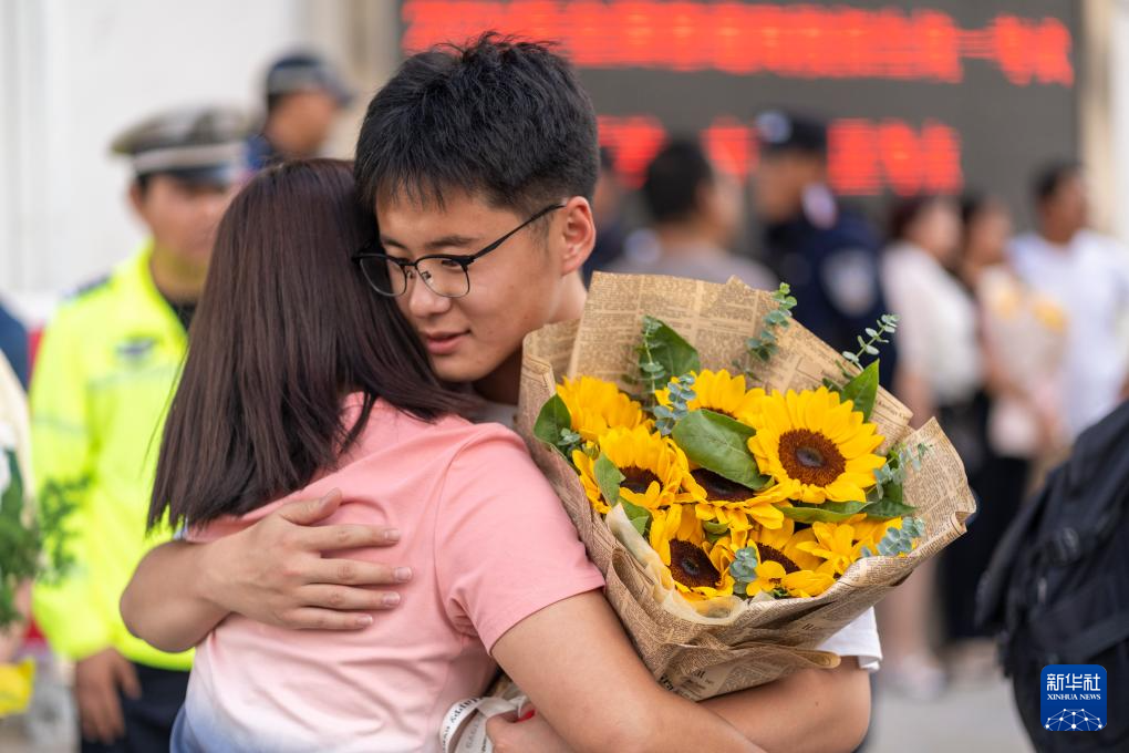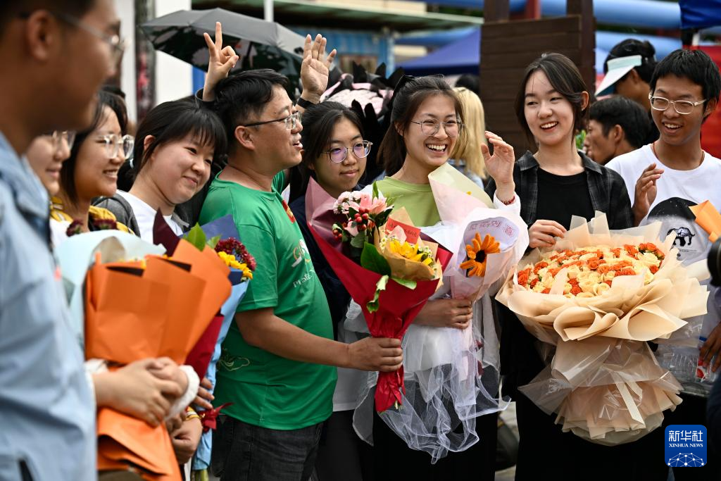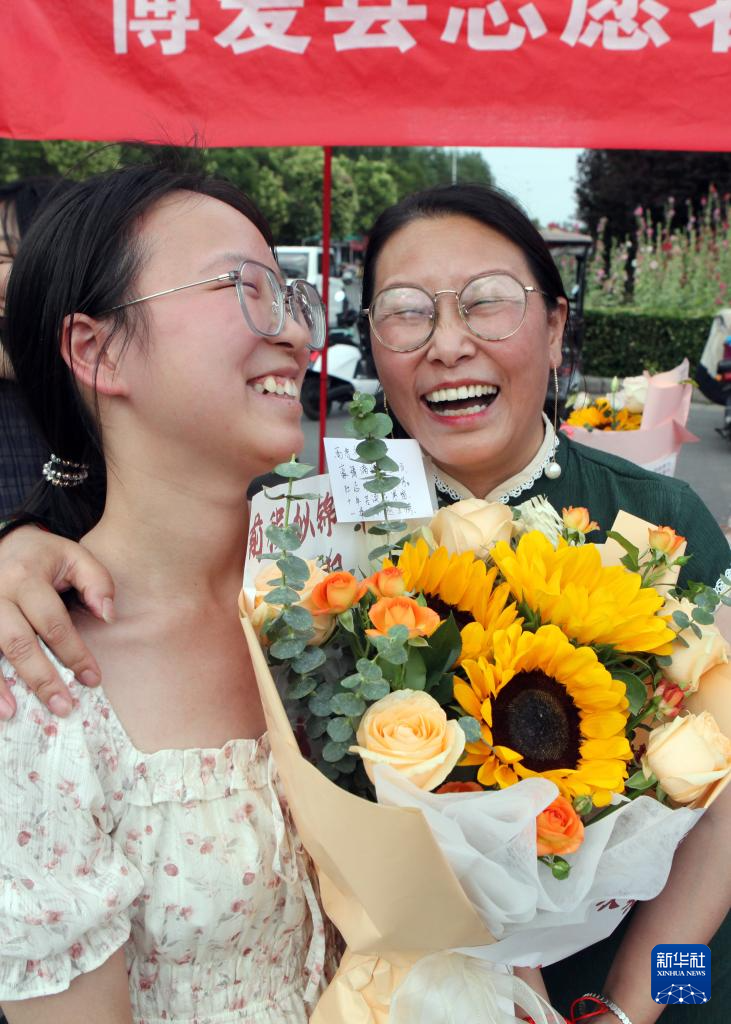 6月8日,在河南省焦作市博爱县第一中学考点,家长为走出考场的孩子送上鲜花。