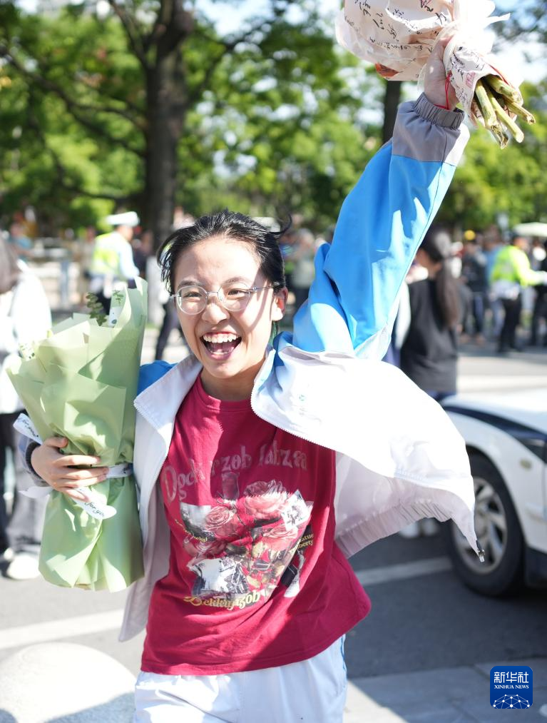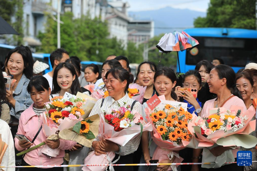 6月8日,在云南省昆明市第五中学考点,考生手持鲜花庆祝考试结束。