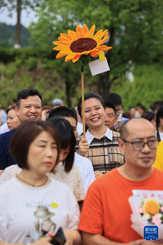 6月8日,在四川遂宁涪江中学考点,家长手拿寓意“一举夺魁”的向日葵迎接考生。