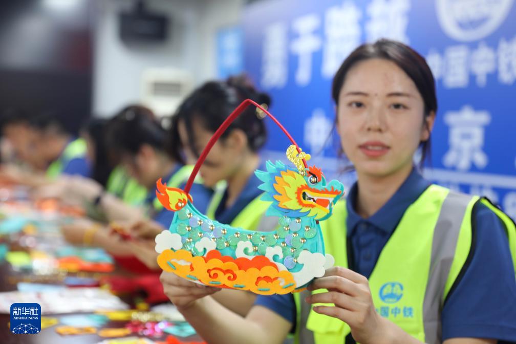 6月8日,中铁北京工程局合肥华侨城项目部开展“体验民俗过端午”活动,建设者展示刚组装的龙舟模型。