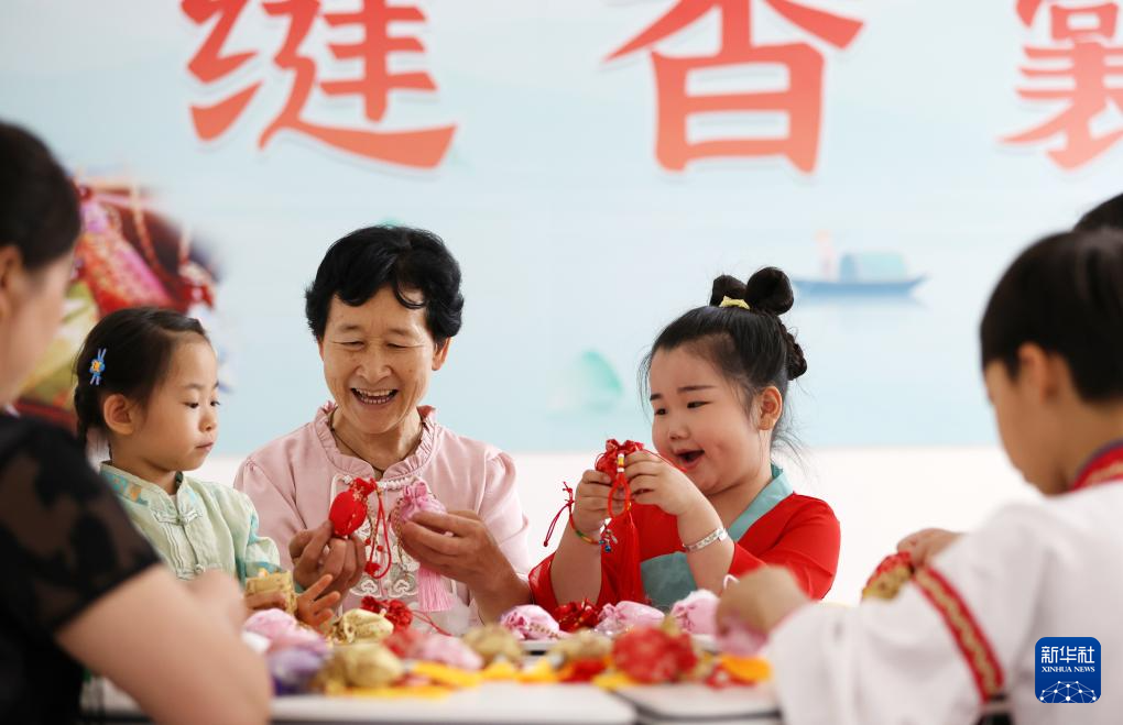 6月8日,山东省临沂市郯城县郯城街道府东社区居民为孩子讲解端午佩香囊民俗。