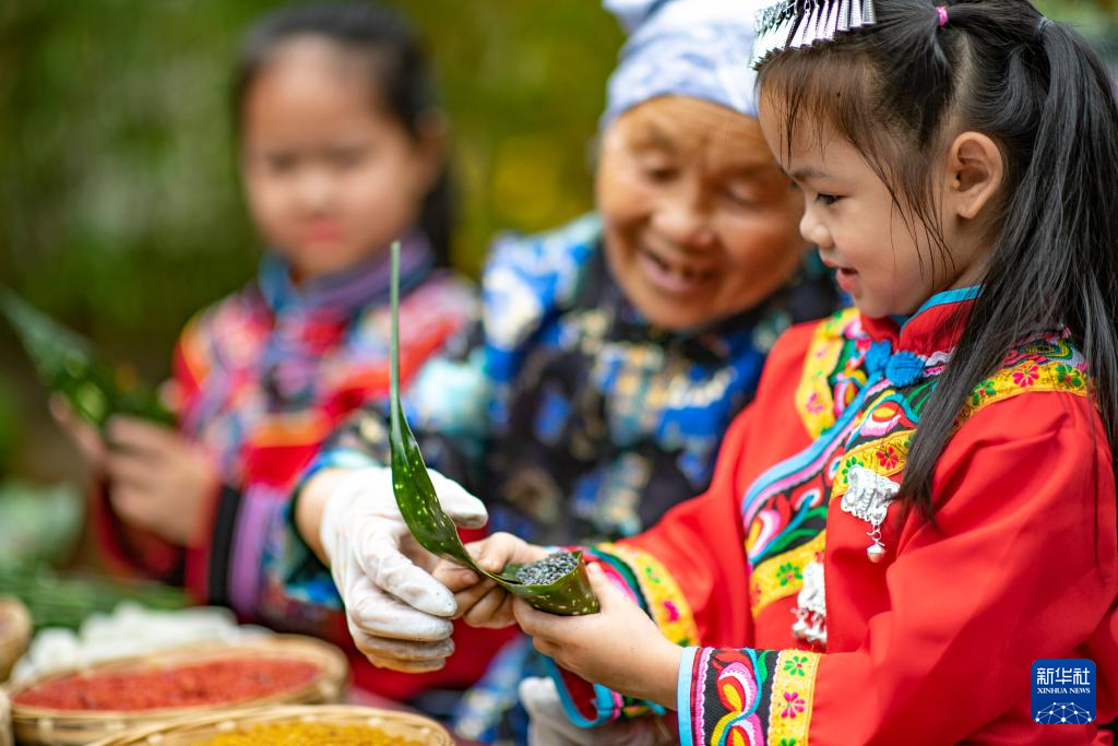 6月8日,在云南省文山壮族苗族自治州文山市,小朋友在长辈的指导下体验包五色粽子。