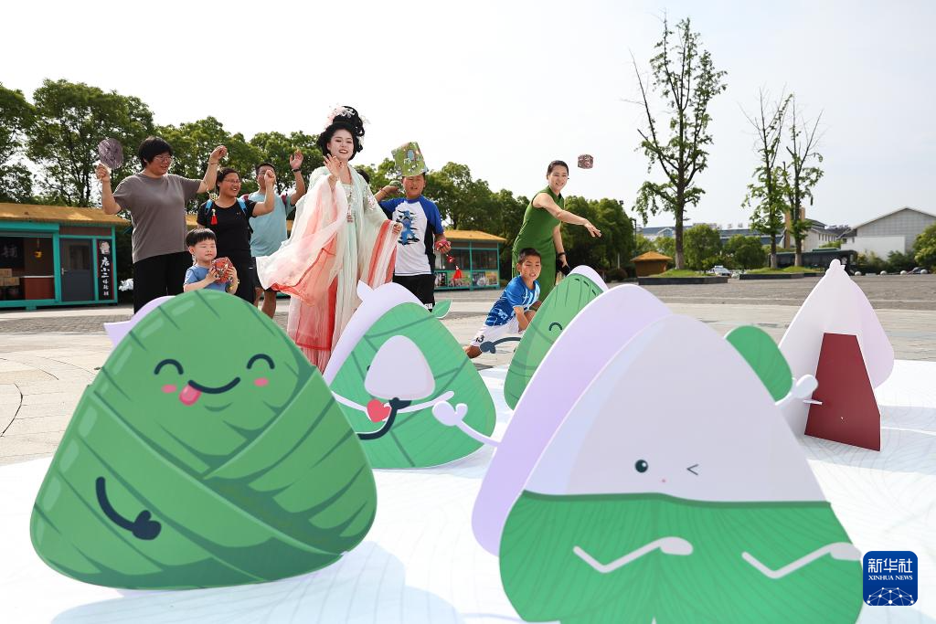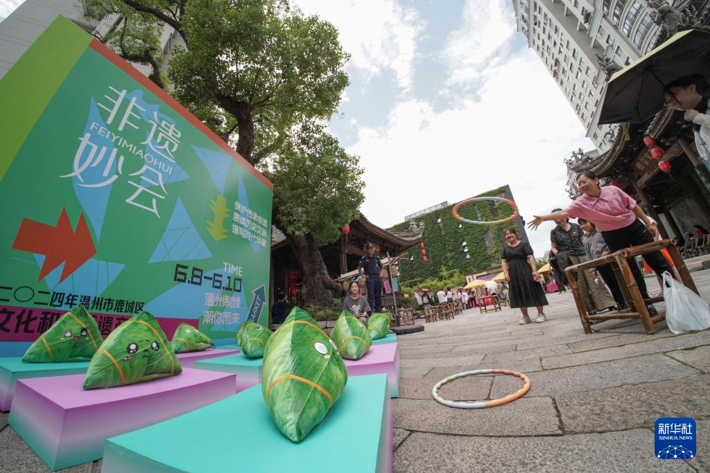 6月8日,在浙江省温州市鹿城区公园路,游客参加套粽子游戏。