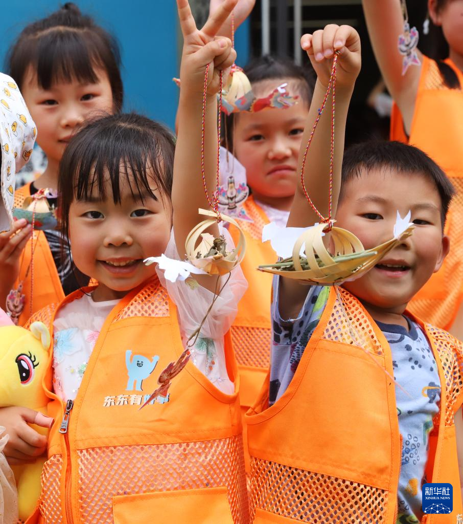 6月8日,在浙江省台州市路桥区路北街道,小朋友展示自己制作的“龙舟”。