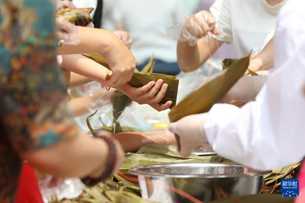 6月8日,市民在浙江省嘉兴市文化艺术中心举行的“国潮非遗 粽情端午”主题活动上包粽子。