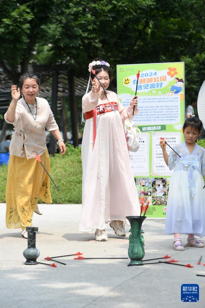 6月8日,在武汉市颐湖公园,人们体验投壶游戏。