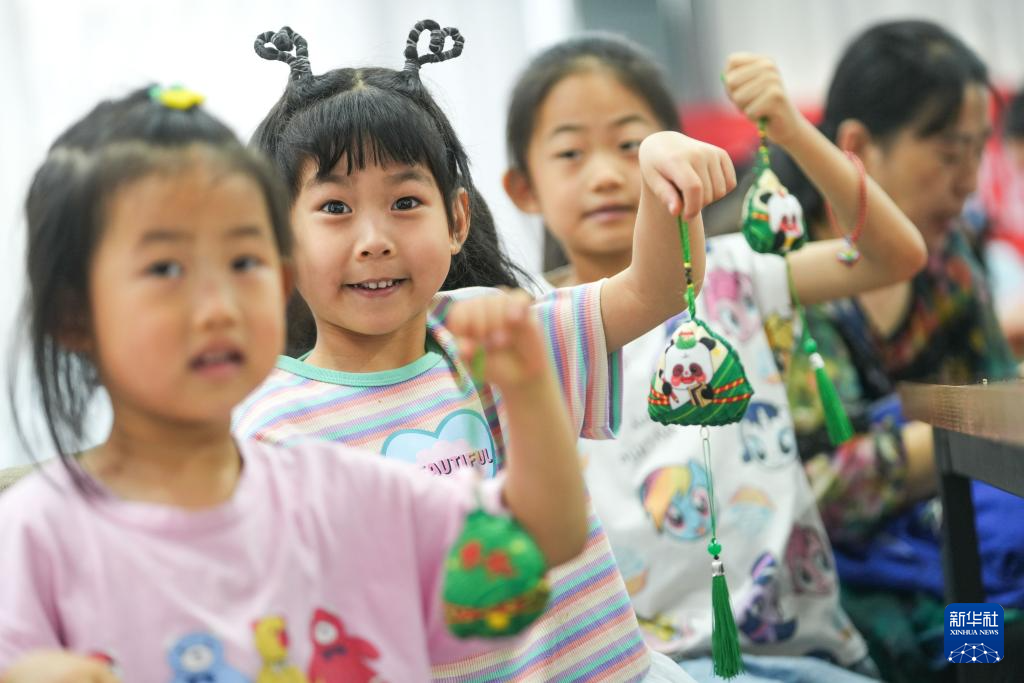 6月8日,山东省邹平市黄山街道月河社区的孩子展示自己制作的端午香囊。