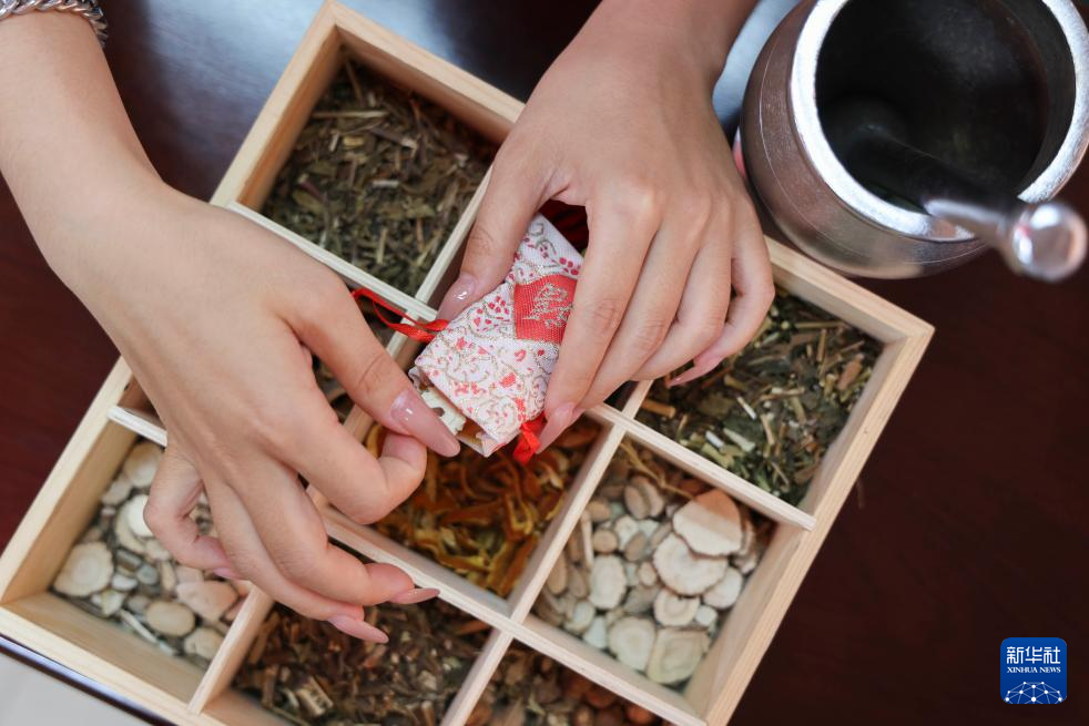 6月6日,山东省临沂市兰山区银雀山街道居民在制作中药香囊。