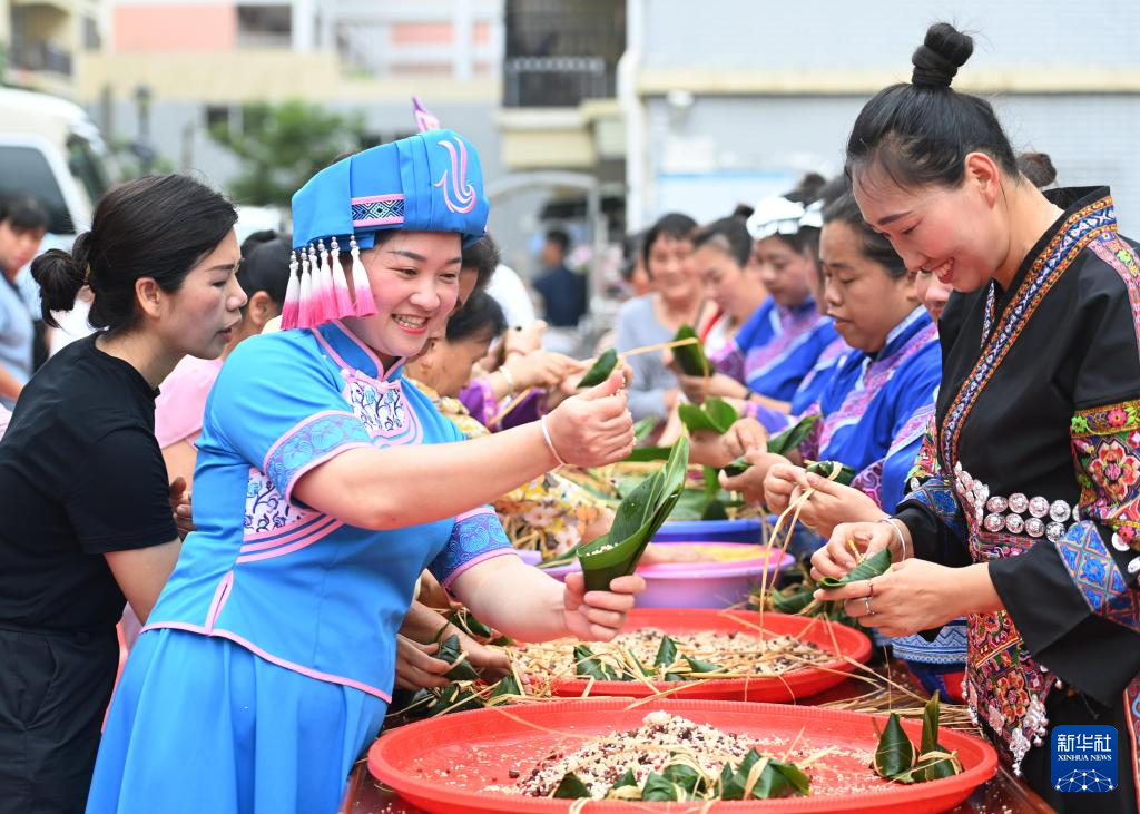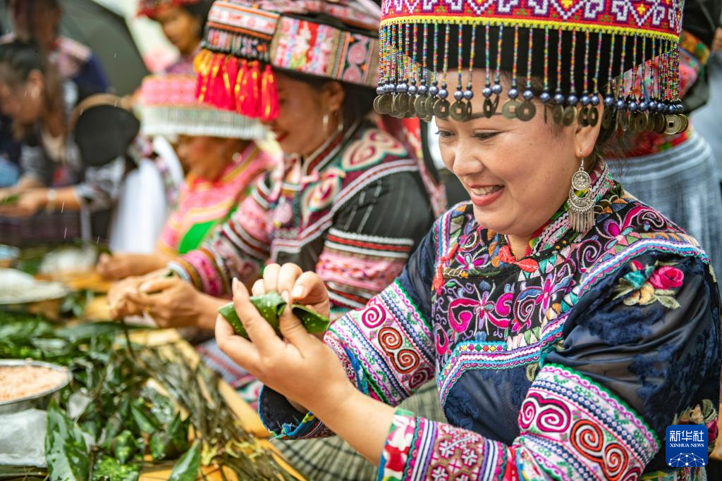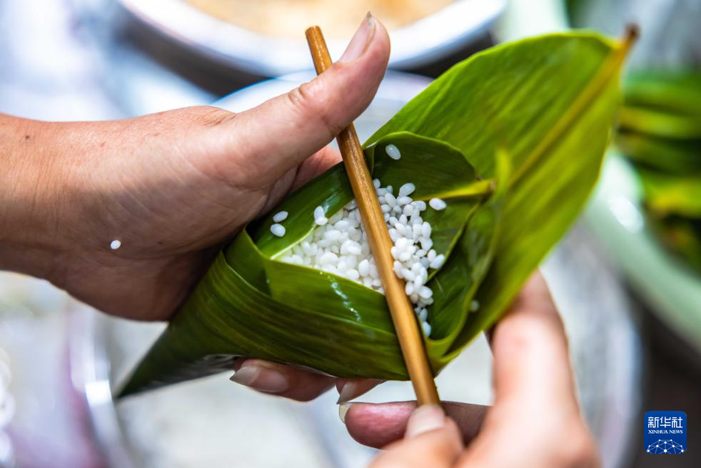 6月7日,居民在贵州省安顺市西秀区蔡官镇北斗社区包粽子。