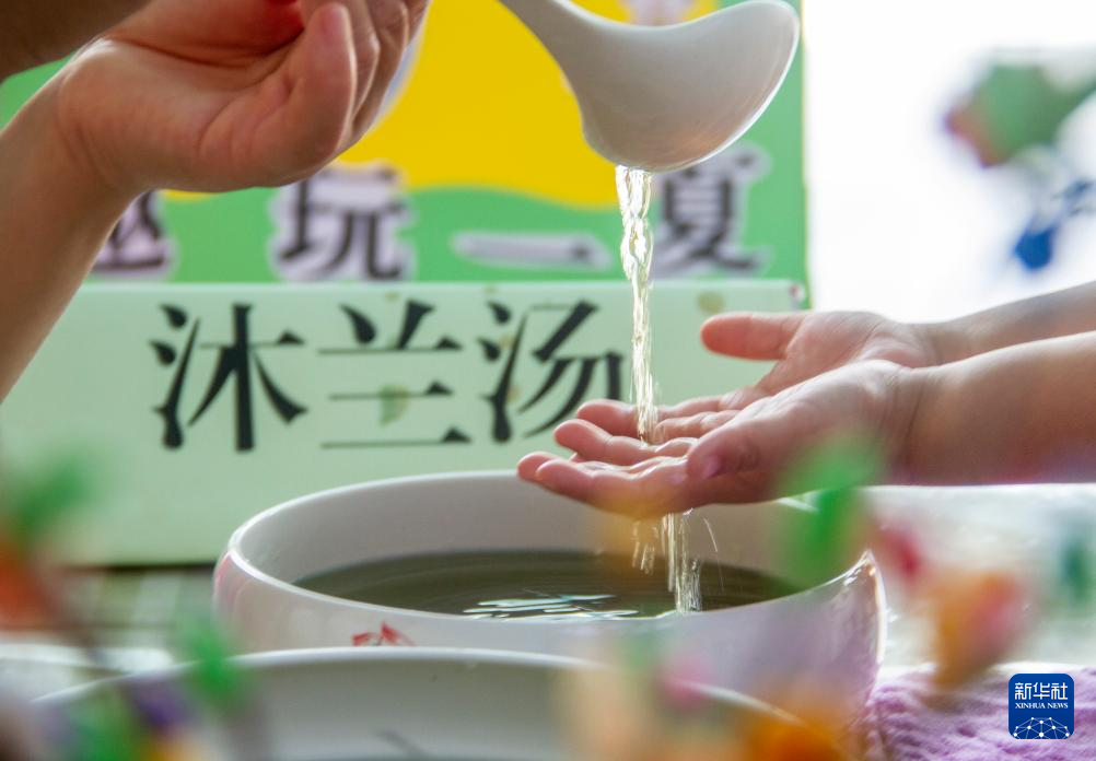6月7日,河南省商丘市夏邑县会亭镇金阳光幼儿园的孩子在体验端午民俗“沐兰汤”。