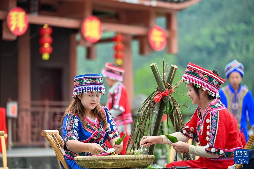 6月7日,在广西罗城仫佬族自治县易地搬迁安置区“仫佬家园”,搬迁群众在参加包粽子比赛。