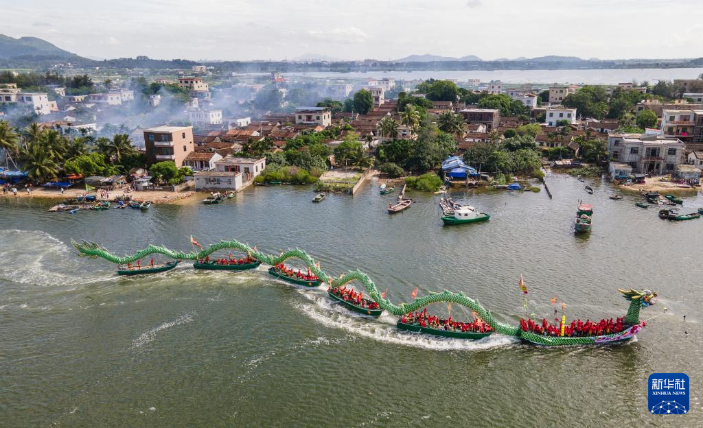 6月9日,在海南省万宁市东澳镇,当地村民用多条小渔船头尾相连组成的“巨龙”在海中畅游(无人机照片)。