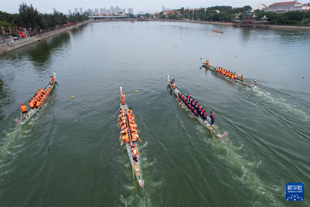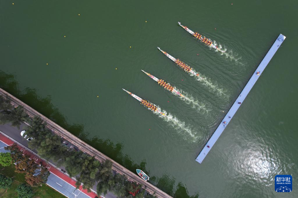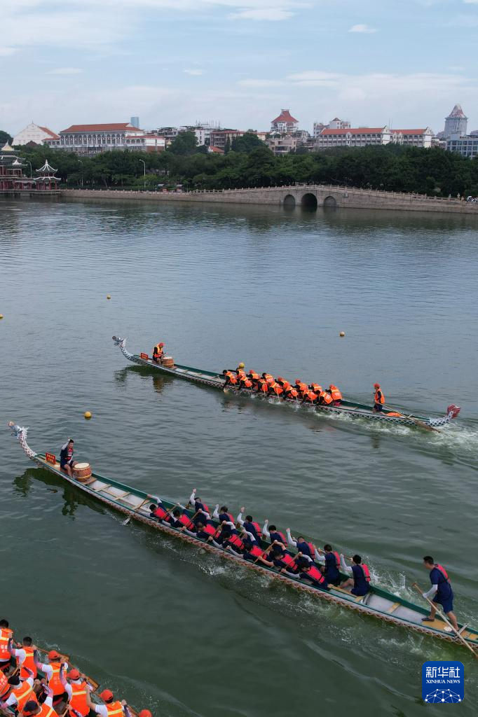 6月12日,消防员在福建厦门集美龙舟池进行龙舟比赛(无人机照片)。
