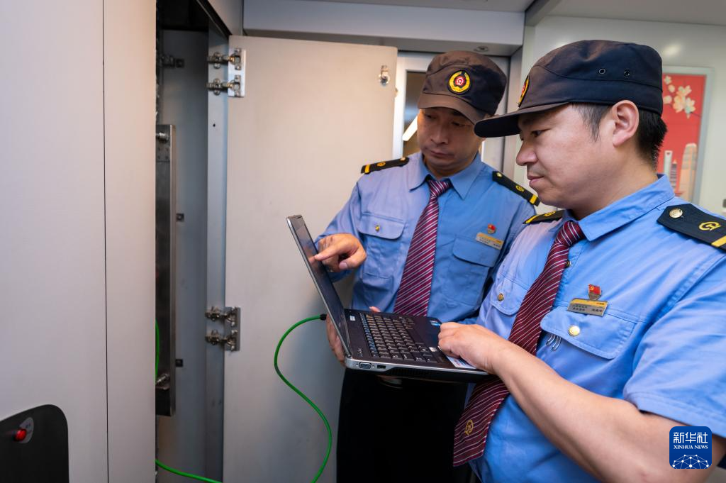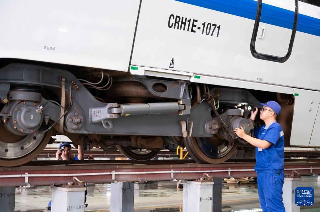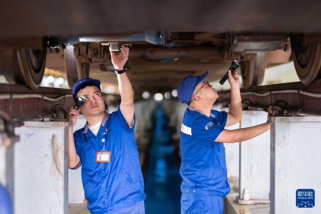 6月14日,在上海动车段南翔动车运用所,地勤机械师黎鹏(左)、夏迅对CRH1E-1071动车组转向架进行检查。