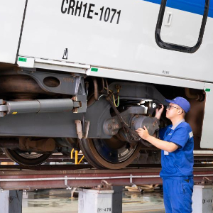 6月14日,在上海动车段南翔动车运用所,地勤机械师夏迅对CRH1E-1071动车组转向架侧面部件进行检查。