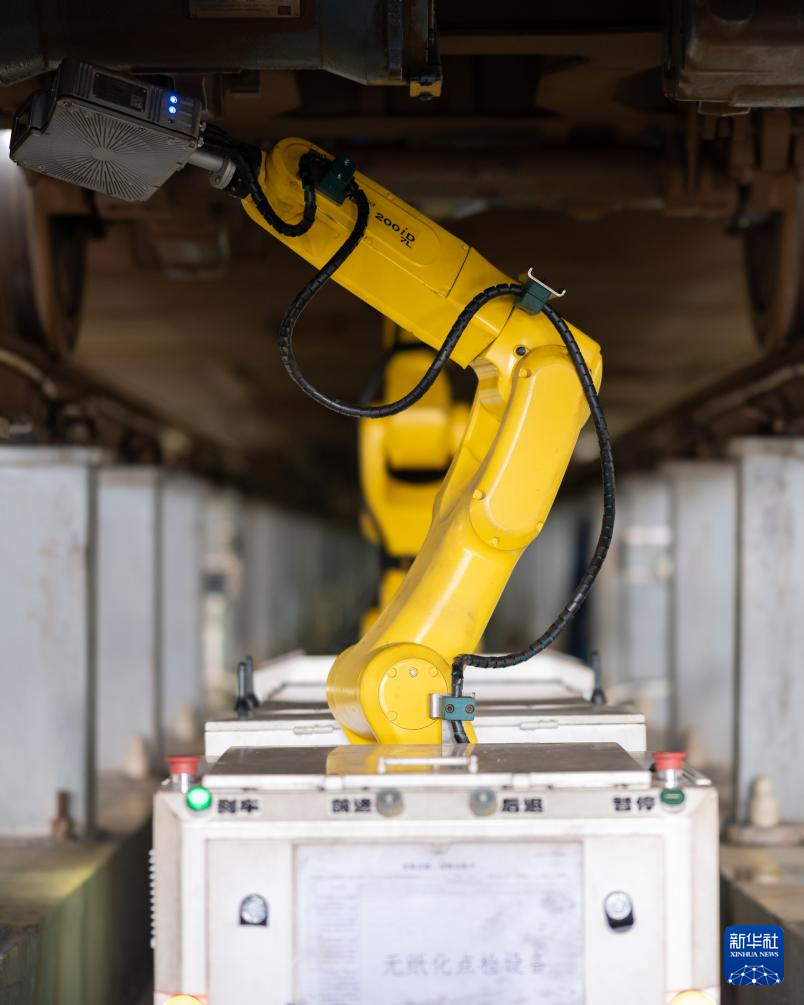 6月14日,在上海动车段南翔动车运用所,检修机器人对CRH1E-1071动车组转向架进行扫描拍照。