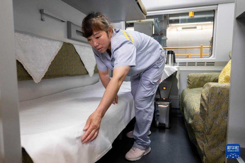 6月14日,在上海动车段南翔动车运用所,车辆保洁人员对CRH1E-1071动车组高级卧铺包厢床单被品进行更新。