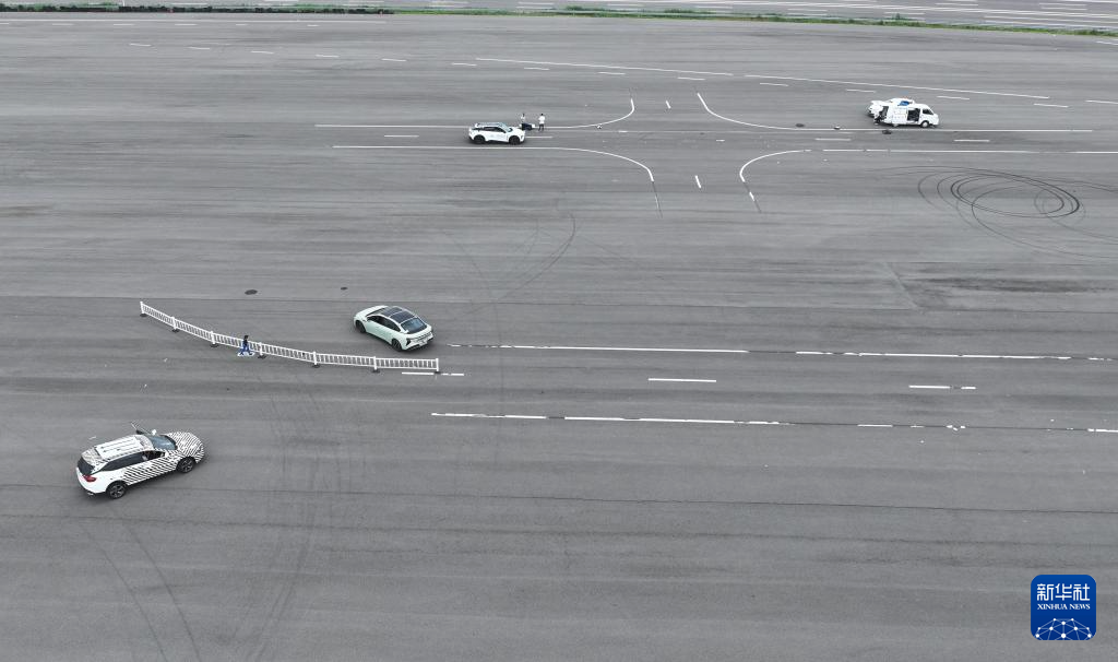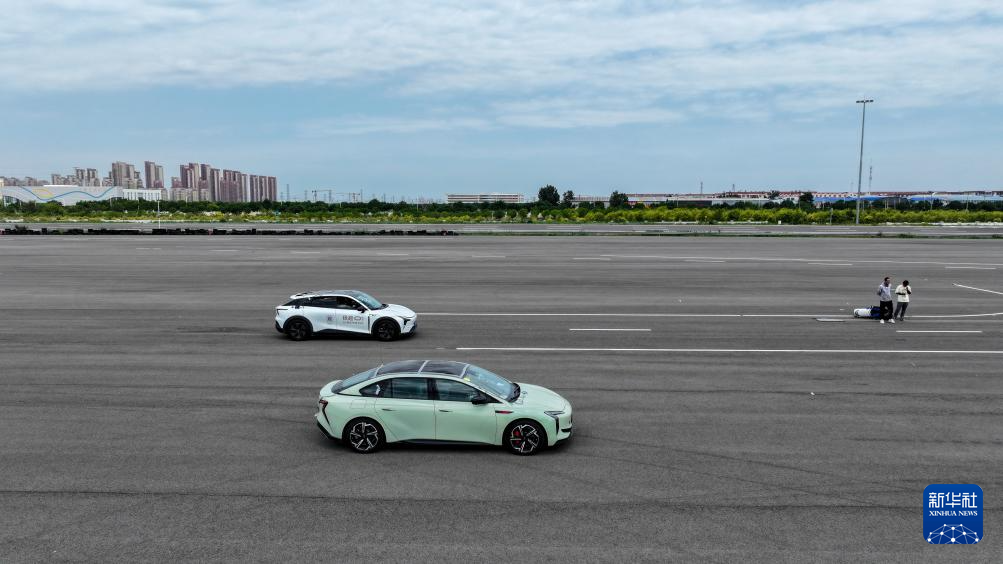 6月14日,智能网联测试车辆在天津(西青)国家级车联网先导区封闭测试场内进行自动驾驶主动安全功能测试(无人机照片)。