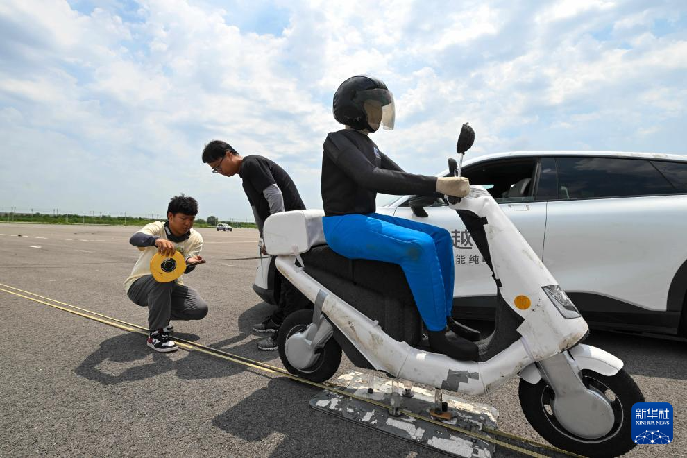6月14日,测试人员对一款智能网联汽车转弯规避非机动车主动安全测试进行极限状态测量。