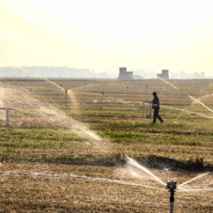 6月15日,河南省焦作市温县祥云镇李肇村农民在喷灌刚出苗的玉米田。