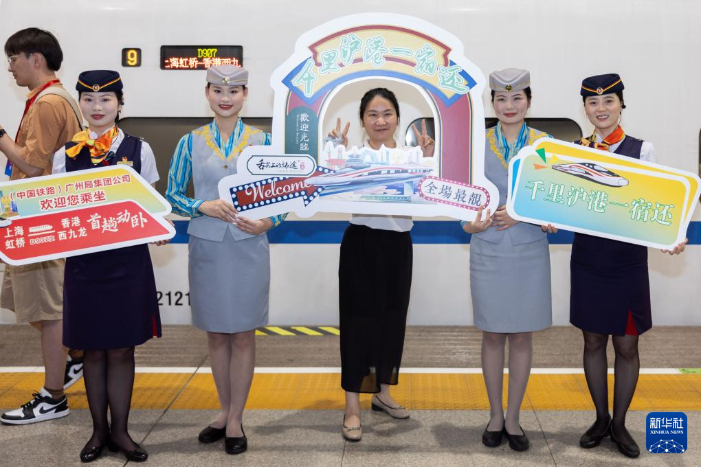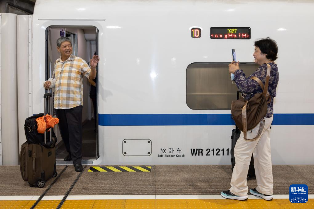 6月15日,乘坐上海虹桥至香港西九龙D907次高铁动卧列车的旅客在上海虹桥站站台留影。新华社记者 王翔 摄pagebreak
